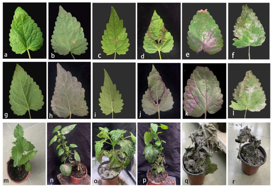 Pathogenicity study of Alternaria pogostemonis. (a,g) The front and back side of leaf inoculated of the control leave; (b,h) Front and back of leaf at the beginning of needling experiment; (c,i) Front and back of leaf in the middle of needling experiment; (d,j) Front and back of leaf in late needling experiment; (e,k) Front and back of leaves in the early stage of mycelium suspension experiment; (f,l) Front and back of leaves at late stage of mycelium suspension experiment; (m) Control plant; (n–r) Early, middle, late stage of mycelium suspension experiment.