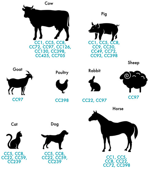 Colonization and infection by MRSA in animals have been described several times since the 1970s. The occurrence of these cases covers a wide spectrum of animals, ranging from domestic animals to wild species, terrestrial or aquatic, in the natural habitat or in captivity [73,74]. MRSA CC398, which is typically found in livestock, has been identified in humans as a colonizer and a cause of infections. This is a situation that requires rigorous surveillance as it reflects the ability of these bacteria to evolve and adapt to various animal or human hosts. In particular, this clone has the ability to colonize a wide variety of hosts, including dogs, cats, sheep, cows, goats, poultry, rabbits and horses.