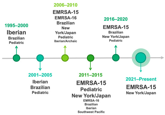 MRSA strains known today resulted from processes of genetic recombination of pre-existing strains. Throughout this process of evolution, there was a selection of some advantageous characteristics that made these strains successful in a given geographic location [22,23]. Furthermore, the predominant lineage in that geographic location, after reaching a peak of dominance, tends to decline and later disappear, being replaced by a new lineage [24]. This clonal replacement process has been observed worldwide [25]. The acquisition of different types of Staphylococcal Cassette Chromosome mec (SCCmec) by methicillin-susceptible S. aureus (MSSA) strains of different genetic origins underlies the origin of MRSA pandemic clones such as those belonging to CC8: Archaic (ST250-I), Iberian (ST247-I), Brazilian (ST239-III) and USA300 (ST8-IV); and clones belonging to CC5, CC22, CC30 and CC398: New York/Japan (ST5-II), EMRSA-15 (ST22-IV), EMRSA-16 (ST36-II) and LA-MRSA (ST398-V), respectively [19,26].