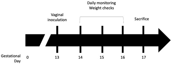 Chorioamnionitis was induced with adaptations from a previously described model (see Figure 1) [41]. Timed pregnancies were established in wild type (WT) or iNOS- mice and pregnancy was confirmed by examination and consistent weight gain over the first 12 days of pregnancy. On gestation day 13, GBS strain CNCTC 10/84, grown to stationary phase, was pelleted and resuspended in PBS in a 1:1 mixture with 10% sterile gelatin to increase viscosity. The GBS mixture was diluted and plated to determine the intravaginal inoculum, which corresponded to ~108 CFU/mL. Dams were then intravaginally inoculated under isoflurane anesthesia with 50 µL of the GBS mixture. Mice were subsequently single-housed and monitored daily for general wellbeing, weight gain or loss, and for preterm delivery. If the dams had not delivered prematurely by gestation day 17 they were euthanized and dissected to evaluate for colonization and infection.