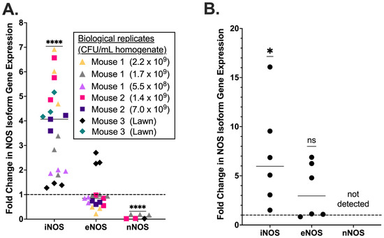 Placental NOS expression following GBS infection. RT-qPCR was performed on RNA isolated from murine placentas following chorioamnionitis with GBS strain CNCTC 10/84. Inducible NOS (iNOS) expression was found to be significantly increased, whereas endothelial NOS (eNOS) was unchanged and neuronal NOS (nNOS) was downregulated. Each shape represents an individual mouse and each color represents an individual placenta tested in triplicate. The inset table shows GBS CFU density for the mouse placentas analyzed. Lawn indicates full coverage of plate with bacteria that is unable to be quantified (A). Human chorionic villi dissected from two freshly collected placentas delivered by cesarean section in the absence of labor or other infectious or inflammatory complications was infected ex vivo with GBS strain CNCTC 10/84 then used for RNA isolation and RT-qPCR in triplicate technical replicates to assess expression of NOS isoforms (B). iNOS showed significantly increased expression following GBS exposure, compared to sham infected controls. eNOS expression was not significantly affected. nNOS was not detected from infected or control samples. (**** p < 0.0001, * p < 0.05; one sample t and Wilcoxon test; dotted lines indicate expression in the non-infected normalization control samples; horizontal lines within data points indicate median values).