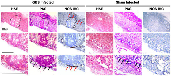 Histopathology and immunohistochemical staining of murine placenta for iNOS localization. Placentas from dams with GBS chorioamnionitis developed areas of abscess (outlined in dotted line) extending from the junctional zone into the labyrinth. Periodic acid-Schiff (PAS) staining revealed a band of dense pink staining in the glycogen cells of the junctional zone (black arrows). Immunohistochemical (IHC) staining for iNOS expression revealed diffuse upregulation with strong localized expression in the junctional zone and areas of abscess (red arrows). Placentas from sham-inoculated dams displayed less iNOS antibody staining and retained normal cellular and anatomic structural organization. (H&E: hematoxylin and eosin).
