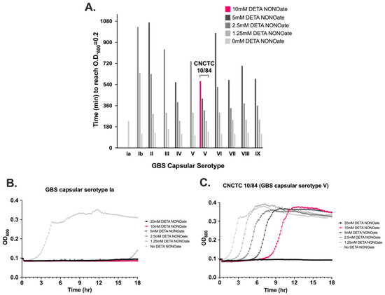 To determine the response of GBS to NO, we exposed 10 GBS strains from the CDC Active Bacterial Core Surveillance Program strain collection, representing all capsular serotypes as well as strain CNCTC 10/84, a capsular serotype V strain, to diethylenetriamine/nitric oxide adduct (DETA NONOate), a NO adduct that releases nitric oxide into liquid solution at a steady rate. The GBS strains were grown for 18 h in liquid culture in graded concentrations from 1.25 mM to 20 mM DETA NONOate and absorbance was measured every 10 min. We noted significant differences in growth kinetics among the strains (Figure 5A). GBS strain CNCTC 10/84 had better growth at all DETA NONOate concentrations, and was the only strain to grow at 10 mM DETA NONOate. In contrast, the serotype Ia GBS strain did not grow in the presence of DETA NONOate until approximately 16.5 h (Figure 5B,C), with other strains showing intermediate growth phenotypes.
