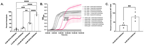 GBS strains were grown overnight to late-log phase in TS broth then all cultures were normalized to OD600 = 1.0 the following morning. Normalized GBS cultures were added individually as a 1:50 dilution to TS broth with graded concentrations of diethylenetriamine/nitric oxide adduct (DETA NONOate, NOC-18, Santa Cruz Biotechnology, cat # sc-202247B). A stock solution of 100mM of DETA NONOate was prepared, filter sterilized, and then serially diluted to 20 mM, 10 mM, 5 mM, 2.5 mM, and 1.25 mM in TS, respectively. DETA NONOate is a diazeniumdiolate that releases nitric oxide into aqueous solution at a steady rate with a half-life of approximately 20 h [49,50]. Samples were loaded into a 96-well clear, flat bottom plate and covered with a lid that had been pre-treated with sterile defogging solution. The absorbance (OD600) was read every 10 min for 18 h at 37 °C using a Molecular Devices SpectraMax M4 (San Jose, CA, USA).