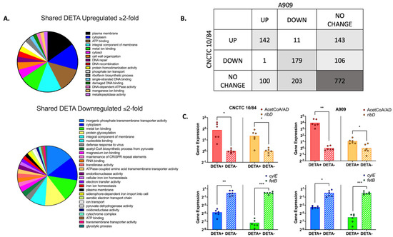 We suspected that GBS employs genetically regulated adaptive responses to environmental NO. To determine transcriptional changes due to NO exposure, we extracted and sequenced RNA (RNA-seq) from GBS strains CNCTC 10/84 and A909, a capsular serotype Ia comparator, following exposure to 1.5 mM DETA NONOate or vehicle only control growth. This sub-lethal DETA NONOate concentration was chosen to permit comparison between the more sensitive A909 strain and the more tolerant CNCTC 10/84 strain (Figure 5A). CNCTC 10/84 and A909 represent commonly isolated capsular serotypes in clinical neonatal infection [66]. RNA-seq revealed that both strains had genome-wide responses to NO and that there were distinct transcriptomic profiles following NO exposure (Figure 7, Supplemental Figure S1, Supplemental Data S1). Figure 7A shows clusters of orthologous genes (COG) predicted functional classes of all shared genes with at least twofold upregulation or downregulation in response to DETA exposure. There were 142 shared upregulated and 179 shared downregulated genes between CNCTC and A909, while 772 had no change (Figure 7B). Individual genes with shared upregulation or downregulation greater than fourfold are listed in Table 1 and Table 2 along with consensus functional annotations determined with the PANTHER database [67]. Supplemental Data S2 shows all orthologous genes with differential responses to DETA exposure, grouped by fold-expression thresholds. The most upregulated gene in response to DETA, in both CNCTC 10/84 and A909, was a bifunctional acetaldehyde-CoA/alcohol dehydrogenase (A909 gene locus SAK_RS00425 and CNCTC 10/84 gene locus W903_RS00440) (Table 1). There were 13 shared genes with at least a four-fold decrease in expression (Table 2), of which six were classified as ABC transporters in their NCBI-published genome annotations. FetB, a YBBM-related iron export transporter (A909 gene locus SAK_RS04090 and CNCTC 10/84 gene locus W903_RS03770) was the most downregulated gene, with a 16-fold decrease in gene expression following NO exposure. The cyl operon that influences βH/C production was slightly downregulated in both CNCTC 10/84 and A909 (LFC −1.97 and −0.91, respectively).