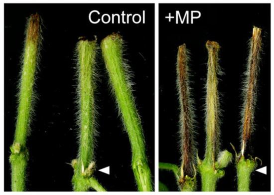 Lesion development on soybean variety ‘AG3039′ after inoculation with agar plug (1/4-strength PDA (potato dextrose agar) plug; “Control”) and Macrophomina phaseolina (“+MP”) using the cut-stem assay (see Section 2). White arrows indicate the unifoliate node.
