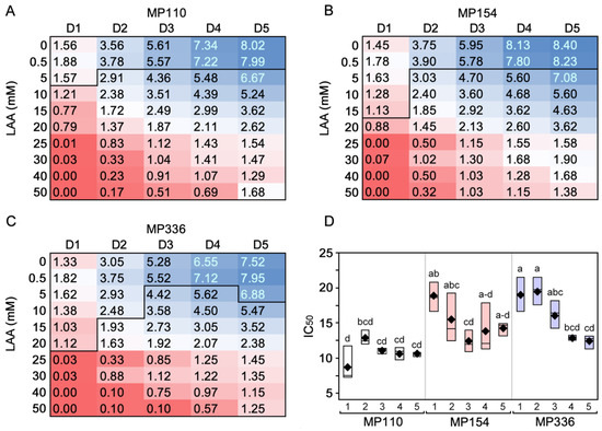 Comparison of colony growth on media containing ascorbic acid with media not containing ascorbic acid (i.e., 0 mM) was significantly decreased. At 3 and 4 DPPL, all three isolates grown on 5 mM ascorbic acid showed significantly decreased growth compared to control plates. However, at 1 DPPL, MP110, MP154, and MP336 differed from control at 10 mM, 20 mM, and 25 mM, respectively. At 2 DPPL, MP110 and MP154 differed from control at 5 mM, whereas MP336 differed at 15 mM. At 5 DPPL, MP110 and MP154 differed from control at 5 mM, whereas MP336 differed at 10 mM. Overall, MP154 and MP336 exhibited a significantly higher IC50 than MP110 (F = 13.96; P < 0.0001) (Table 2; Figure 3).