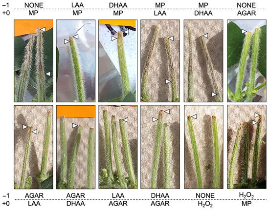 Representative soybean cut-stem pathogenicity assay lesion development after treatments were applied in this experiment. Pre-treatments (−1) were performed one day prior to treatments (+0). White arrows indicate the approximate extent of necrotic lesions in cut stems. Abbreviations: DHAA = dehydroascorbic acid (oxidized form), LAA = L-ascorbic acid (reduced form), MP = Macrophomina phaseolina.