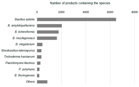 MFs are a kind of fertilizer containing living microorganisms, which can promote plant growth, increase the quality of agricultural products, and/or improve plant stress resistance [6,7,8]. The development and application of MFs in China has a history of nearly 80 years. In the 1960s, rhizobium inoculants to soybean, alfalfa, and vetch were put into practice in China on a large scale [9]. Nowadays, MFs in China have developed into a wide variety of products with diverse functions [9,10,11]. However, the latest statistics show that 93% of MF products in the present Chinese market are made from or at least contain Bacillus species, with B. subtilis accounting for 67% and B. amyloliquefaciens accounting for 21% of the products [12] (Figure 1). It is well known that both species have a strong biocontrol effect against many phytopathogens. Since the registration as an MP is subject to a strict procedure, many manufactures sell their products with biocontrol effect as microbial fertilizers. This is why we consider MFs in China as a type of biocontrol agent and review them here.