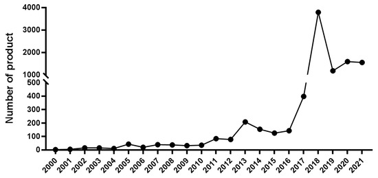 In the past two decades, China’s microbial fertilizer industry has experienced its golden time of rapid development. During the first ten years of the 21st century, only a limited number of MF products were registered each year (Figure 2). In 2006, there were around 500 MF manufacturers in China with an output of 5 million tons and 498 commercial products [13]. Since 2011, the development of the industry has begun a fast track (Figure 2). Until 2017, there had been as many as 6068 MF enterprises, with nearly 3500 products registered and an annual output of more than 12 million tons [14]. Up to the end of 2021, a total of 9563 commercial products have been registered by more than 2000 manufacturers. The production capacity in 2020 was as high as 24 million tons, being applied to a 2 × 108 h.a. area of land [15]. In an overview, the MF production peaked in 2018, when the number of registered products began to drop but still remained at a high level compared to the previous ten years.