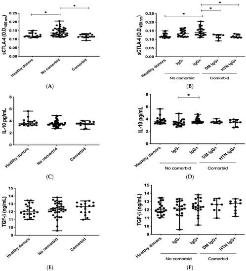 The levels of soluble CD40 (sCD40), TGF-ß, IL-10 (RayBiotech, Peachtree Corners, GA, USA), and soluble CTLA-4 (sCTLA-4) (Thermo Fisher Scientific, Waltham, MA, USA) were assessed by enzyme-linked immunosorbent assay (ELISA) in the serum of comorbid and non-comorbid COVID-19-recovered subjects, as well as healthy donors. Briefly, the assay sensitivity for CTLA-4 was settled at 0.13 ng/mL (sCTLA-4; REF: BMS276), TGF-ß at 18 pg/mL (cat. ELH-TGF-ß1), IL-10 at 1 pg/mL (cat. ELH-IL-10), and sCD40 at 50 pg/mL (cat. ELH-CD40). All procedures were carried out according to the manufacturer′s instructions. The signal was measured on a Thermo Scientific Multiskan FC photometer (v1.00.94; Thermo Scientific, Waltham, MA, USA).