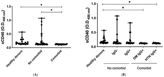 Determination of the co-stimulation molecule sCD40 in patients recovered from COVID-19. (A) Optical density values at 450 nm (OD450) of sCLA-4 in serum of healthy donors, recovered non-comorbid COVID-19 subjects, and recovered comorbid COVID-19 subjects. (B) Optical density values at 450 nm (OD450) of sCLA-4 in serum of healthy donors, recovered non-comorbid seronegative (IgG−) and seropositive (IgG+) subjects, and recovered comorbid seropositive (DM IgG+ and HTN IgG+) subjects by ELISA. The Kruskal–Wallis test and Dunn′s post hoc test were performed for statistical analysis. Data are presented as median + range. * p < 0.05 was considered significant.