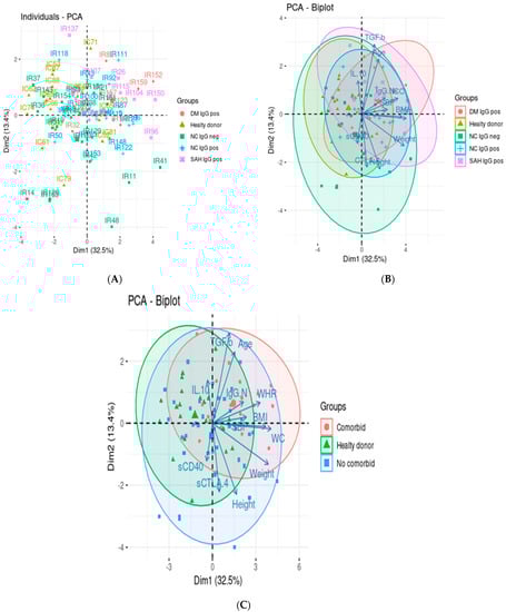 Principal component analysis. The score plot (A) of PCA showing the pattern of the individuals stratified as healthy donors (n = 20), seropositive non-comorbid subjects (n = 20), seronegative non-comorbid subjects (n = 20), comorbid diabetes mellitus subjects (DM; n = 8), and comorbid hypertension subjects (HTN; n = 10). (B) Bi-plot showing the relationships between the variables studied and anthropometric data stratified in the five groups. (C) Bi-plot showing the relationships between the variables studied and anthropometric data stratified in three groups, namely healthy donors, non-comorbid subjects, and comorbid subjects. The numbers are our internal identification subject. X- and Y-axes contain the values of the first and second principal components produced by the PCA.