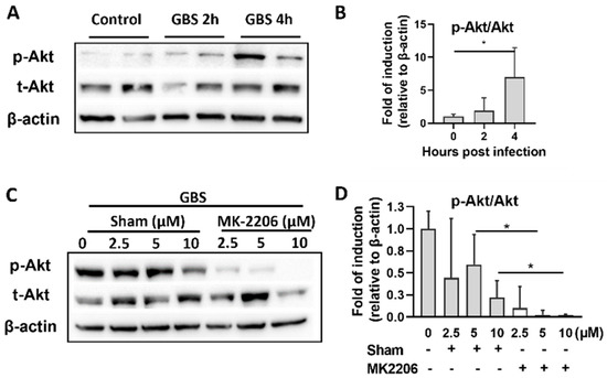 The Akt pathway is activated by several extracellular stimuli such as cytokines, growth factors and pathogens [24]. To investigate whether Akt signaling is activated by GBS, we exposed A549 cells to GBS for 2 h and then removed extracellular GBS following treatment with antibiotic containing media. Cell lysates were collected at 2 and 4 h post infection. Activation of Akt was assessed by measuring its phosphorylation level. Western blot analysis showed a significant increase in Akt phosphorylation 2 and 4 h following GBS infection (Figure 1A,B). Treatment with Akt inhibitor MK-2206 (at 5 or 10 μΜ) resulted in inhibition of Akt phosphorylation (Figure 1C,D). Concentration of 5μΜ was selected for further cell culture experiments since it provoked effective inhibition without affecting cell proliferation (Supplementary Figure S1).