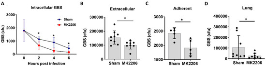 Next, to test the efficacy of Akt inhibition in GBS clearance in vivo, we utilized a model of GBS pneumonia; 1.5 × 106 GBS were administered intratracheally in C57BL/6 mice previously treated with either MK-2206 (100 mg/kg) via oral gavage or sham. Akt inhibition in lungs upon in vivo MK-2206 treatment was verified with western blot (Supplemental Figure S2). GBS bacterial counts were significantly lower in the lungs of MK-2206 treated mice with GBS infection compared to untreated mice (Figure 2D).