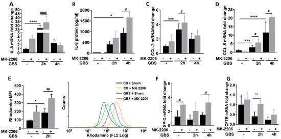 Akt inhibition induces inflammatory response and production of reactive oxygen species (ROS) in GBS infected alveolar epithelial cells. Interleukin (IL)-8 mRNA (A) and IL-8 protein levels (B) and mRNA expression of Chemokine (C-C motif) ligand (CCL)-2 (C) and CCL-5 (D) upon GBS infection in alveolar epithelial (A549) cells that were pretreated with MK-2206 or sham. (E) Reactive oxygen species production in A549 cells treated with MK-2206 or sham, upon GBS infection, measured by rhodamine excitation mean fluorescence intensity (MFI). mRNA levels of surfactant protein D (SP-D) (F) and Cystic Fibrosis Transmembrane Receptor (CFTR) (G) upon GBS infection in A549 cells that were pretreated with Akt inhibitor MK-2206 or sham. Data are illustrated as bar graphs, plotted as mean ± S.D and statistical analysis was performed using One-Way ANOVA. In rhodamine, flow cytometry assay data are represented in bars, plotted as median with range, and statistical analysis was performed with a Kruskal-Wallis test. n = 6–10 per group. * Comparison among GBS infected cells and control; * p < 0.05, ** p < 0.01, *** p < 0.001, **** p < 0.0001. # Comparison among GBS infected cells treated with Akt inhibitor or sham, # p < 0.05, ## p < 0.01, #### p < 0.0001.