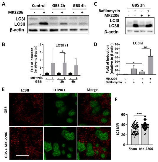 Autophagy is a well-known process of bacterial clearance regulated by the Akt/mTOR pathway, therefore it was examined as a potential mechanism for the increased bacterial clearance observed upon Akt suppression. As lipidation of LC3 (conversion from LC3I to LC3II) has been established as a useful sign for autophagy, we detected LC3 by immunoblotting and fluorescence microscopy [11]. A significant increase in LC3-II/LC3-I ratio was detected in MK-2206 treated epithelial cells upon GBS infection (Figure 4A,B). LC3-II/LC3-I ratio was substantially increased upon bafilomycin treatment, an inhibitor of phagosomal to lysosomal fusion, indicating activation of autophagy and promotion of lysosomal fusion of GBS cargo, in MK-2206 treated epithelial cells (Figure 4C,D) [25]. Moreover, LC3 aggregates, representing autophagosomes, were elevated in MK-2206 treated epithelial cells as were assessed by immunofluorescence (Figure 4E,F).
