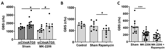Induction of autophagy is important for GBS clearance in alveolar epithelial cells. (A). The GBS bacterial load in A549 epithelial cells pre-treated with sham or MK-2206 and which were incubated with control siRNA or siRNA for autophagy-related (ATG)-5, a central regulator of autophagy. (B). GBS bacterial load in A549 epithelial cells in which autophagy was induced by rapamycin treatment compared to sham (DMSO diluent) treated cells. (C). GBS bacterial load in A549 epithelial cells, treated with MK-2206 or sham, in the presence or absence of rapamycin. Data are illustrated as bars, plotted as median and interquartile range (A,B) or mean ± S.D (C). Statistical analysis was performed using a Student’s t-test (C) or Mann-Whitney test (A,B) between the two groups indicated by line. N = 9–24 per group. * or # p < 0.05, *** p < 0.001.
