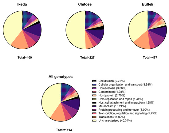 A total of 1061 target proteins (95.3%) were identified that matched either the reference T. orientalis Shintoku genome or related apicomplexan parasites and other protozoans. This represents approximately one quarter of the total predicted proteome of T. orientalis with 4058, 3980 and 3924 genes predicted in the Ikeda, Chitose and Buffeli genomes respectively [22,23]. Approximately three quarters (78%; n = 829) of the proteins identified were aqueous phase proteins, while 22% (n = 232) were from the detergent phase of the TX-114 extraction, representing membrane-associated and other hydrophobic proteins. This proportion of detergent phase proteins was similar to those recovered from Theileria annulata schizonts using TX114 [24]. The total number of proteins recovered from the T. orientalis Ikeda and Buffeli genotypes was greater than for the Chitose genotype (Table 1). Indeed, one limitation of this study was that the number of proteins identified per genotype was not sufficient to allow for meaningful cross-comparison of all proteins expressed between pathogenic and apathogenic types. The inability to culture T. orientalis in vitro under standard conditions, with experimental infection of animals used for propagation, may also have influenced the protein profile across genotypes.