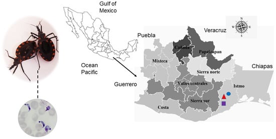 Chagas disease is a significant zoonosis caused by the flagellate parasite Trypanosoma cruzi, transmitted by hematophagous insects of the subfamily Triatominae (Hemiptera: Reduviidae). This disease is endemic in Latin America; an estimated 6–8 million people worldwide are infected, and the parasite causes approximately 50 thousand deaths annually []. Chagas disease is regarded as a public health problem in Mexico, where an estimated 4.06 million people are infected, and 29.5 million are at risk of infection []. The most affected age group is 25–44. The Mexican states with the highest number of reported acute cases are: Veracruz, Jalisco, Morelos, Querétaro, Oaxaca, Chiapas, and Guerrero. In 1940, Mazzotti described the first cases of the disease in the state of Oaxaca. Currently, a Chagas disease prevalence of 17.7% has been estimated in the region, with 672,947 infected individuals []. In localities of the Isthmus of Tehuantepec, where 11 species of triatomines are known to be vectors of the disease [], autochthonous cases of T. cruzi-associated cardiomyopathy, megaesophagus, and megacolon have been reported [].