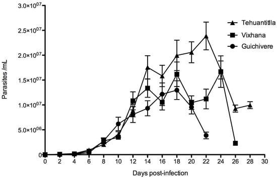 Although all isolates were obtained from the same vector (M. phyllosoma), parasitemia values in mice infected with an initial inoculum of 106 parasites/mL differed throughout the infection. The Tehuantitla isolate showed the highest parasitemia, with 2.3 × 107 parasites/mL on day 22, followed by Vixhana, with 1.7 × 107 parasites/mL on day 24, and the lowest parasitemia was elicited by the Guichivere isolate, with 1.2 × 107 parasites/mL on day 22 post-inoculation.