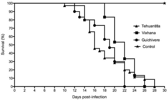Survival of CD-1 mice infected with Tehuantitla, Guichivere, Vixhana isolates (N = 32 in each group), and the control group (N = 16) for 30 days post-infection.