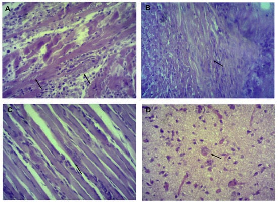 Histopathological studies have reported amastigote nests in different organs of mice infected with T. cruzi isolates. For example, with isolates derived from T. barberi (Oaxaca) and T. mazzottii (Jalisco), amastigote nests were mostly found in mouse heart and muscle [,]. Herein, amastigote nests were identified in mouse heart, esophagus, gastrocnemius (muscle) and brain (Figure 4, Figure 5 and Figure 6). There are few reports of the presence of amastigote nests in brain and esophagus, since the amount is lower than in the heart and its detection is often difficult []. In this sense, molecular tests like a qPCR can be very useful to detect low levels of tropism in some organs, as its sensitivity allows us to quantify RNA and DNA of some parasites.