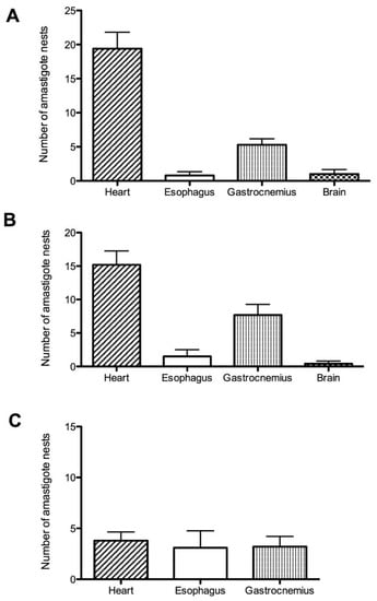 The organs for histopathological study were excised from three mice infected with each isolate, which were euthanized on the day of maximum parasitemia. The organs were placed in Falcon tubes (Sarstedt) with 15-mL of 10% formaldehyde for fixation. Sagittal sections were made in paraffin-embedded organs. Ten 4-micron serial sections were made from each organ and stained with hematoxylin-eosin (H-E) to identify amastigote nests in the heart, esophagus, gastrocnemius, and brain; a total of 100 micro serial sections were made in each organ of each mouse. In each slice, 100 fields were counted under a 100X objective, using a light microscope (Zeiss Primo Star, Oberkochen, Germany) and the number of amastigote nests was recorded. The maximum number of amastigote nests found was taken as 100% [].