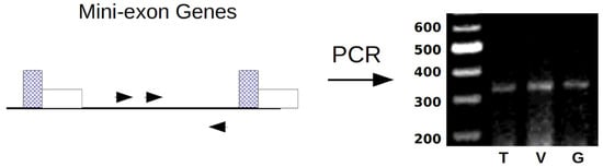 T. cruzi has been classified into six DTUs (TcI, TcII, TcIII, TcIV, TcV, and TcVI) due to its high genetic variability. The intergenic region of the mini-exon gene is widely used to classify T. cruzi to isolates by the PCR analysis as follows: 350-bp (TcI) or 300-bp (TcII, TcV, and TcVI), or no product (TcIII and TcIV). In order to genotype and classify each T. cruzi isolate from Tehuantitla, Vixhana, and Guichivere, we amplify the intergenic region of the mini-exon gene. The PCR analysis revealed a band of 350 bp in the three isolates, which were thus identified as TcI (Figure 8).