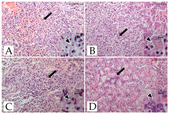 Microscopical investigations showed the presence of necro-hemorrhagic inflammatory foci in the spleen, kidney, liver, and lungs (Figure 1).