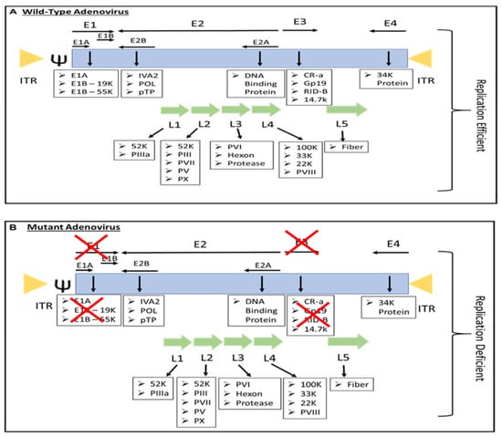 The genome of (A) replication-efficient adenovirus and (B) replication-deficient adenovirus. ITR—inverted terminal repeat; Ψ—viral packaging element; K—glycoprotein; P—pre-protein, X—Deleted.