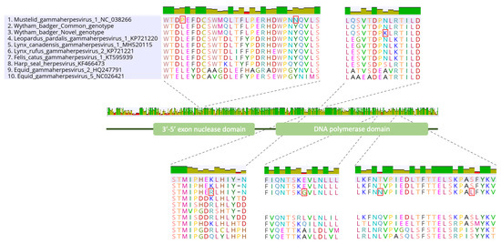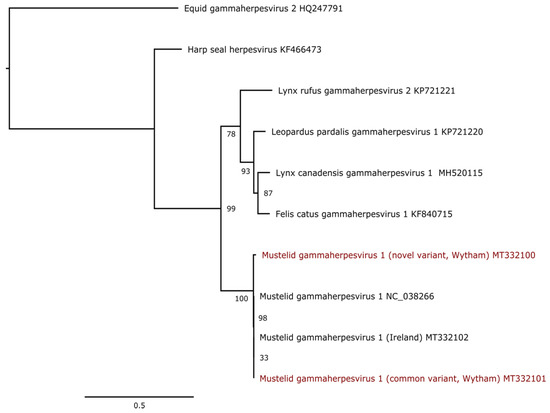 The genetic diversity of herpesviruses strains found within a single host species is typically very low, even between host populations separated by geographical barriers. For example, the gammaherpesvirus (LcaGHV-1) variants found in two geographically distinct Canadian lynx (Lynx canadensis) populations (from Maine, USA, and Newfoundland, Canada) are identical apart from just two synonymous substitutions across the 3.4 kb nucleotide sequences of its partial gB protein and DNApol gene [51]. Considering the generally low mutation rate of herpesviruses and their strong host cospeciation traits [50], the coexistence of two closely related gammaherpesvirus variants in the same population is unusual. A molecular analysis of the DNApol gene of twelve EHV-2 strains circulating in horse herds in Iceland that had been isolated for more than 1000 years, still showed 99% to 100% similarity across a region of 483 base pairs to seven EHV-2 strains from other European countries [52]. Furthermore, country-wide screening for MusGHV-1 in Irish badgers in 2019 showed that 691 base pair sequences from 23 individuals were 100% identical to the reference MusGHV-1 DNApol sequence [21]; all of which demonstrates the stability of species-specific herpesvirus DNApol genes.