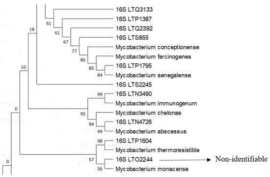 Supplementary Table S1 shows the results obtained for each strain along with the correct species identification of the pathogens. Here, 83.33% (40/48) of the total strains were identified or closely related to a species with this phylogenetic approach. The 16S rRNA gene analysis only allowed the identification of 68.75% (33/48) of the strains. The tree strains were also identified via rpoB (sample LTP1387 as near M. senegalense and M. farcinogenes and LTQ2392–LTS855 as M. conceptionense). The hsp65 gene allowed us to identify LTR2603, LTS244, and LTO3295 as M. fortuitum and LTN4726 as M. abscessus. Remarkably, five “acid-fast” strains were not identified with sequencing as Mycobacterium species but were identified as belonging to the genera Tsukamurella, Nocardia, and Gordonia. See Figure 1 and Figure 2 for examples of the identification using a phylogenetic approach for some of the strains.