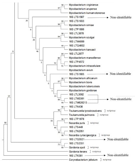 The identification of our isolates showed that many species are hardly mentioned in the medical literature and are relatively unknown as infectious agents for humans. Examples include the species M. porcinum, M. simiae, M. thermoresistibile, M. neoaurum, and M. szulgai [22,23]. Some strains (Supplementary Table S1 and Figure 1 and Figure 2) were unidentifiable because the percentages of divergence were considerably higher than 1.328%, so these could be new mycobacterial species or variants of already known species, or the references sequences were not considered in the phylogenetic analysis. This needs further investigation.