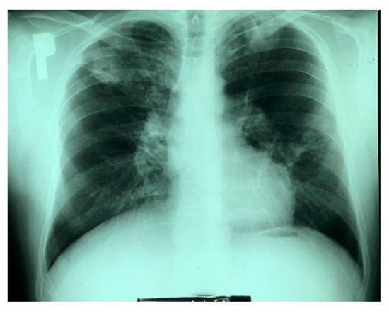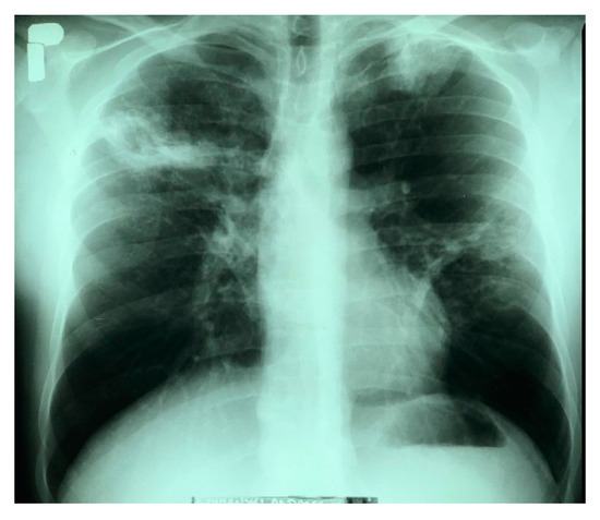 The patient was admitted to the Provincial Complex of Healthcare Institutions, Lung Disease Treatment and Rehabilitation Center in Łódź, II Department of Lung Diseases, (Tuszyn, Poland) because of profuse haemoptysis, which had occurred for the first time in his life. During the anamnesis, the patient complained of a persistent cough that had first occurred 6 months prior. For 2 months, the cough was accompanied by hoarseness and a high fever (slightly above 39 °C), which intensified mainly in the evenings. At the same time, the patient had night sweats. The man suffered from malaise, a lack of appetite, and a weight loss of 6 kg. He did not report any further symptoms, had not received chest radiographs for many years, and there was no history of tuberculosis within his immediate family. The patient disclosed that he had smoked cigarettes since the age of 20. The X-ray image of the lungs revealed an infiltrative lesion in the upper field of the right lung, with a cavity of approximately 35 × 30 mm, an infiltrative lesion in the left apex, and nodular fibrous lesions in the middle field of the left lung. The left diaphragm and diaphragm-costal angles were without pathological changes. The heart silhouette was within normal limits (Figure 1).