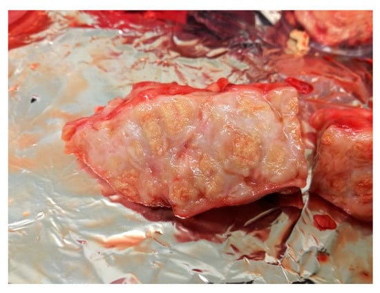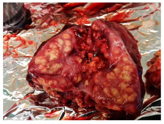 | 4. | T-138 | enlarged and haemorrhagic | enlarged and haemorrhagic | caseous tubercles (Figure 4) | caseous tubercles | haemorrhagic | enlarged and haemorrhagic |