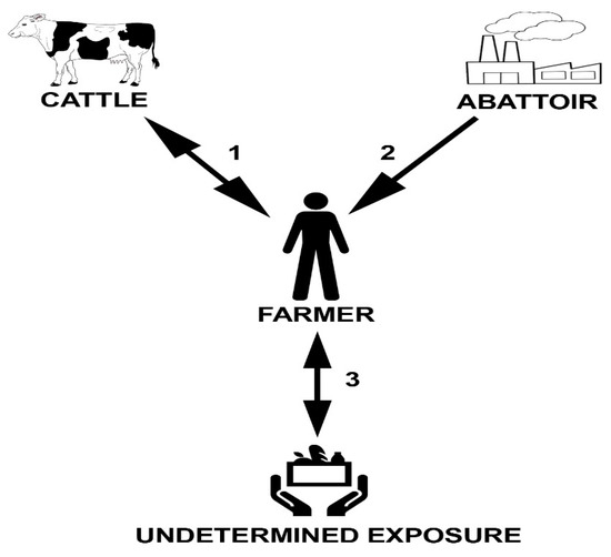 Possible pathways of M. bovis transmission, which include: (1) farmer infected while working at abattoir, transmitting M. bovis to cattle on his farm; (2) farmer infected by exposure to M. bovis-infected cattle on his farm; (3) farmer infected with M. bovis by undetermined exposure (e.g., environmental, ingestion of M. bovis-contaminated dairy products or food, or human-to-human transmission) with transmission to his cattle.