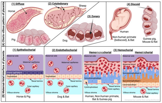Three main types of placental classification were proposed by Grosser based on histological structure (Figure 1B) [74]. This classification recognizes the histologic relationship of the chorion and uterine wall, and therefore, it is more apt and informative in describing the placental function [71,72]. The epitheliochorial type of placenta (seen in horses, pigs, and ruminants) is most superficial or least intimate because the maternal blood—fetal tissue interactions are limited by layers of uterine epithelial cells and fetal trophoblast cells only. In endotheliochorial placenta, withdrawal of maternal uterine epithelium and connective tissue after implantation informs the maternal endometrial contact with fetal trophoblasts. The endotheliochorial type of placenta is seen in four major clades of eutherian mammals, including carnivores, dogs, and cats. Lastly, the hemochorial placenta is considered most invasive, as in this case maternal hemochorial epithelial and endothelial cells are degraded, and thereby maternal blood is in open exchange with fetal trophoblast cells (syncytiotrophoblast and cytrotrophoblast). The hemomonochorial, hemodichorial, and hemotrichorial placentas consist of one, two, and three trophoblast layers, and are noted in primates, rabbits, and rodents, respectively [73,75].