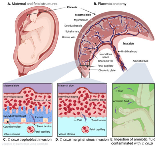 Human placenta and congenital transmission of T. cruzi. (A) Human maternal and fetal structures. (B) Human placental anatomy showing maternal side consisting of the myometrium, decidua basalis, spiral artery, uterine vein, intervillous space and the fetal side with chorionic villi, fetal capillary, chorionic plate, umbilical cord, and amniotic fluid. (C) T. cruzi infects different types of trophoblasts of the placental chorionic villous (cytotrophoblasts and syncytiotrophoblasts), then invades the capillaries of the umbilical cord and the fetus. (D) Marginal sinus of the chorionic plate is deprived of trophoblasts so the parasite can readily cross and once it reaches the chorion and exceeds the mesenchymal (villous stroma), it can gain access to the umbilical cord vessels and fetal capillaries. (E) Parasites that reach the amniotic fluid (green) after replicating in the placenta can contaminate the fetus orally.