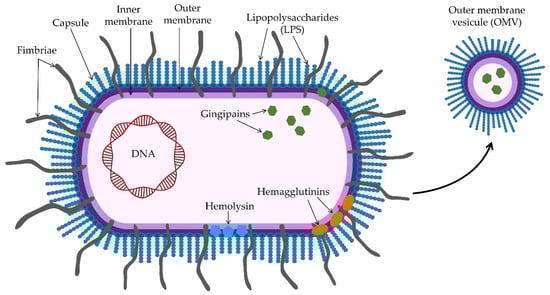 Gram-negative bacteria, during their growth, release outer membrane vesicles (Figure 1) while maintaining the integrity of the outer membrane []. OMVs consist of outer membrane proteins, phospholipids, lipopolysaccharides, periplasm parts, DNA, and RNA [,,]. Vesicles are involved in bacterial adaptation to stress, nutrient acquisition, and maintaining communication with other bacteria and host cells []. They are also responsible for invading host cells and destroying them through pathological mechanisms of avoiding host immune defenses and antibiotic resistance [,]. Various mechanisms can form outer membrane vesicles. One of the formation mechanisms is during the growth of the bacterial cell. Due to growth, the bacterial cell wall is stimulated, and muramyl peptides are released, which, if not absorbed, are generated on the outer membrane and later released [,]. Vesicles are formed where the bond between the peptidoglycan and the outer membrane is weakened. OMVs are accumulated along the outer membrane, containing virulence factors more strongly than in the parent bacterial cell [,]. OMVs can eliminate unwanted substances that accumulate under the influence of stressors and toxins [], carry antigenic substances for the bacterium’s interaction with host cells and drugs, and thus increase the viability of the bacterium [,]. OMVs penetrate better into deep tissues and activate the host’s inflammatory response there, but their virulence depends on the amount of lipids, proteins, and nucleic acids [,]. Most P. gingivalis OMV proteins are membrane proteins, lipoproteins, and extracellular proteins. OMVs also contain noncoding RNAs and lipoproteins that bind heme. P. gingivalis OMVs can return heme-filled OMVs to the biofilm and provide other bacteria in the plaque with nutrients, allowing other species to reproduce. Other bacteria may also use oligosaccharides, monosaccharides, peptides, and amino acids produced by hydrolases in OMVs [,,]. FimA and Mfa1 found in OMVs serve to communicate P. gingivalis with other bacteria. They have excellent communication with S. aureus and can inhibit other bacteria in the biofilm, such as S. gordonii, creating a favorable environment for P. gingivalis [,]. Small RNAs within OMVs are considered mediators of host–guest communication due to their ability to modulate gene expression in multiple cells and species, for which they use many regulatory mechanisms. Some of them are the capacity to bind protein targets and modify their function and blockage of the ribosome-binding site. Bacterial sRNAs can be released into the environment and transferred to other microbes and host cells []. Specific for periodontal pathogens, msRNAs can deactivate anti-inflammatory host response by deactivating the expression of genes that encode cytokines such as IL-5 and IL-13 []. OMVs can be embedded in a cell in two different ways. One way is actin-mediated, where OMVs use host cell receptors to initiate F-actin polymerization and, thus, enter the cell. The second way is by fimbriae and the process of endocytosis, which depends on P13K, Rac1, and GTPase [,]. Once they enter the host cell, OMVs can cause enormous damage. They inhibit the proliferation of endothelial cells and fibroblasts and angiogenesis, which slows down the healing process []. They activate pathogen recognition receptors (PRRs), leading to cytokine secretion and gingival epithelial apoptosis []. They stimulate macrophages to produce large amounts of proinflammatory factors such as interleukins IL-6, IL10, and IL-12p70, TNFα, and IFNb and activate caspase-1 and release LDH, ultimately resulting in cell apoptosis [,,].