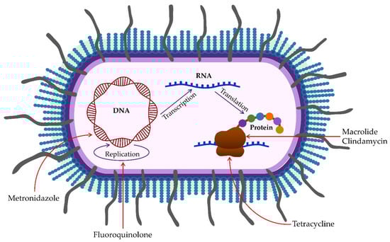 Mechanisms of antibiotic action on Porphyromonas gingivalis. Tetracyclines inhibit protein synthesis by binding to the 30S and 50S subunits of the bacterial ribosome. Macrolides and clindamycin inhibit protein synthesis by binding to the 50S subunit of the bacterial ribosome. In contrast, metronidazole and fluoroquinolone inhibit bacterial DNA replication.