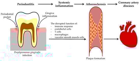 Dental plaque microorganisms and their products, especially in advanced forms of the disease, can reach the blood during various therapeutic procedures (scaling, surgical procedures) and can reach distant organs through the blood. This primarily refers to the influence of periodontal pathogens on the development of subacute endocarditis, the development of coronary heart disease, atherosclerosis, and ischemic infarction [,] (Figure 3). Bacteremia of oral origin as a source of microorganisms can damage the heart valves causing bacterial endocarditis []. Among others, P. gingivalis is a risk factor for prothrombotic status that might worsen in patients with atrial fibrillation [].