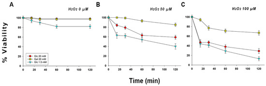 In the 50 μM hydrogen peroxide assay, the effect of exposition begins to be evident just after initiating the experiment, at 15 min of exposition. Parasites grown in 20 mM galactose displayed a higher viability percentage when compared to the other two treatments (20 mM galactose assay: 85 ± 2%; 20 mM glucose assay: 59 ± 2%; 1.5 mM glucose assay: 40 ± 2%).