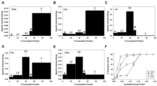 Subcellular localization of PGM activity in Trypanosoma cruzi epimastigotes. Panels A–E: differential centrifugation of a homogenate of T. cruzi epimastigotes. Fractions are plotted according to their isolation order, from left to right: N, nuclear; LG, large granular; SG, small granular; M, microsomal; and C, cytosol. (A) PGM, (B) PyR, (C) HK, (D) PGI, (E) MDH. Panel (F): partial permeabilization with digitonin of T. cruzi epimastigotes. The means and SD were calculated with three independent experiments.