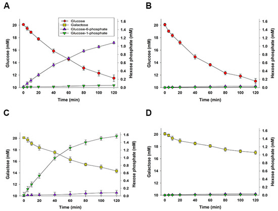 Figure 4 shows the consumption rates of glucose and galactose, and the concomitant release of G6P and G1P. It is worth noting that G6P is mainly released to the supernatant when partially permeabilized epimastigotes consume glucose; in contrast, it is mainly G1P that is released to the supernatant when the partially permeabilized epimastigotes consume galactose. This result agrees with the observed subcellular localization of PGM activity, which is mainly cytosolic and essential for G1P and G6P interconversion. Under our experimental conditions, neither G1P nor G6P are released to the supernatant when partially permeabilized epimastigotes are supplemented with glucose or galactose in the absence of inorganic phosphate (see Figure 4B,D). These observations suggest the existence of an anti-porting mechanism that allows for the inorganic phosphate-dependent release of hexose phosphates to the cytosol, as observed in plant plastids [51,52,53,54,55] and in the human endoplasmic reticulum [56,57].
