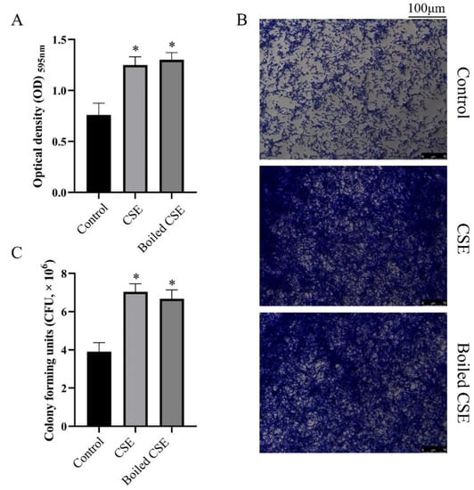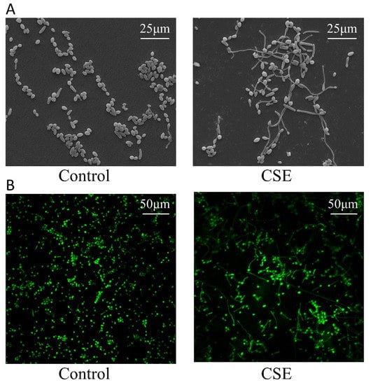 Given that C. albicans biofilms contain yeast and hyphal cells, hyphal morphogenesis could affect the biofilm biomass. To observe the morphology of C. albicans, we performed Scanning electron microscopy (SEM) and Confocal laser scanning microscopy (CLSM) assays. The images showed that CSE promoted hyphal formation of C. albicans (Figure 2A,B).