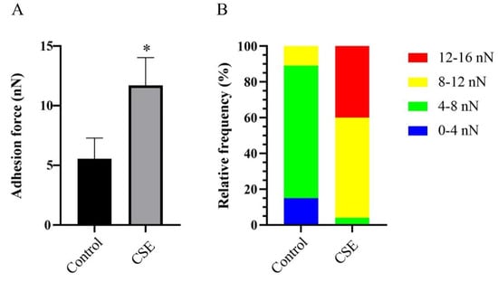 The adhesion force of C. albicans biofilms were calculated from force–distance curves measured by Atomic force microscopy (AFM). As expected, CSE increased the adhesion force of C. albicans biofilms (Figure 5). The adhesion force was found to be 5.546 nN in the control group and 11.718 nN in the CSE treated group (Figure 5A). In the control group, the adhesion force mainly varied from 4 to 8 nN. However, in the CSE treated group, the adhesion force mainly varied from 8 to 12 nN (Figure 5B).