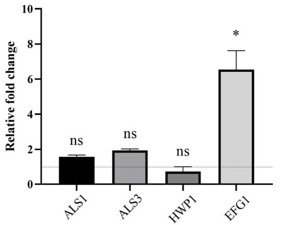 We measured the expression of genes associated with biofilm formation (ALS1, ALS3, HWP1 and EFG1) by RT-qPCR. The data showed that the expression level of EFG1 was upregulated, while the expression level changes of genes ALS1, ALS3 and HWP1 were not statistically significant (Figure 6).