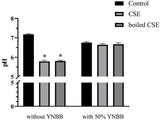 The pH values of CSE and boiled CSE with or without 50% YNBB. BHI liquid medium was set as control. The values are shown as means ± SD from three independent experiments. * p < 0.05.