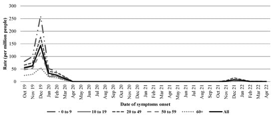 As can be observed in Figure 1, the highest incidence rate (260 cases per million) was observed in December 2019 among children aged 0–9 years old. The overall rate during the same period was 144 cases per million and rapidly decreased during January 2020. Influenza transmission continued at low levels during the rest of the season (February–April 2020).